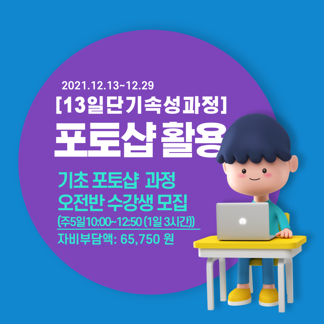 ※13일 단기속성과정※ 포토샵 활용 훈련기간 : 2021-12-13 ~ 2021-12-29 훈련시간 : 10:00~12:50(3시간) 교육내용 : 포토샵 기초 및 실무활용 자비부담 30% : 65,750원