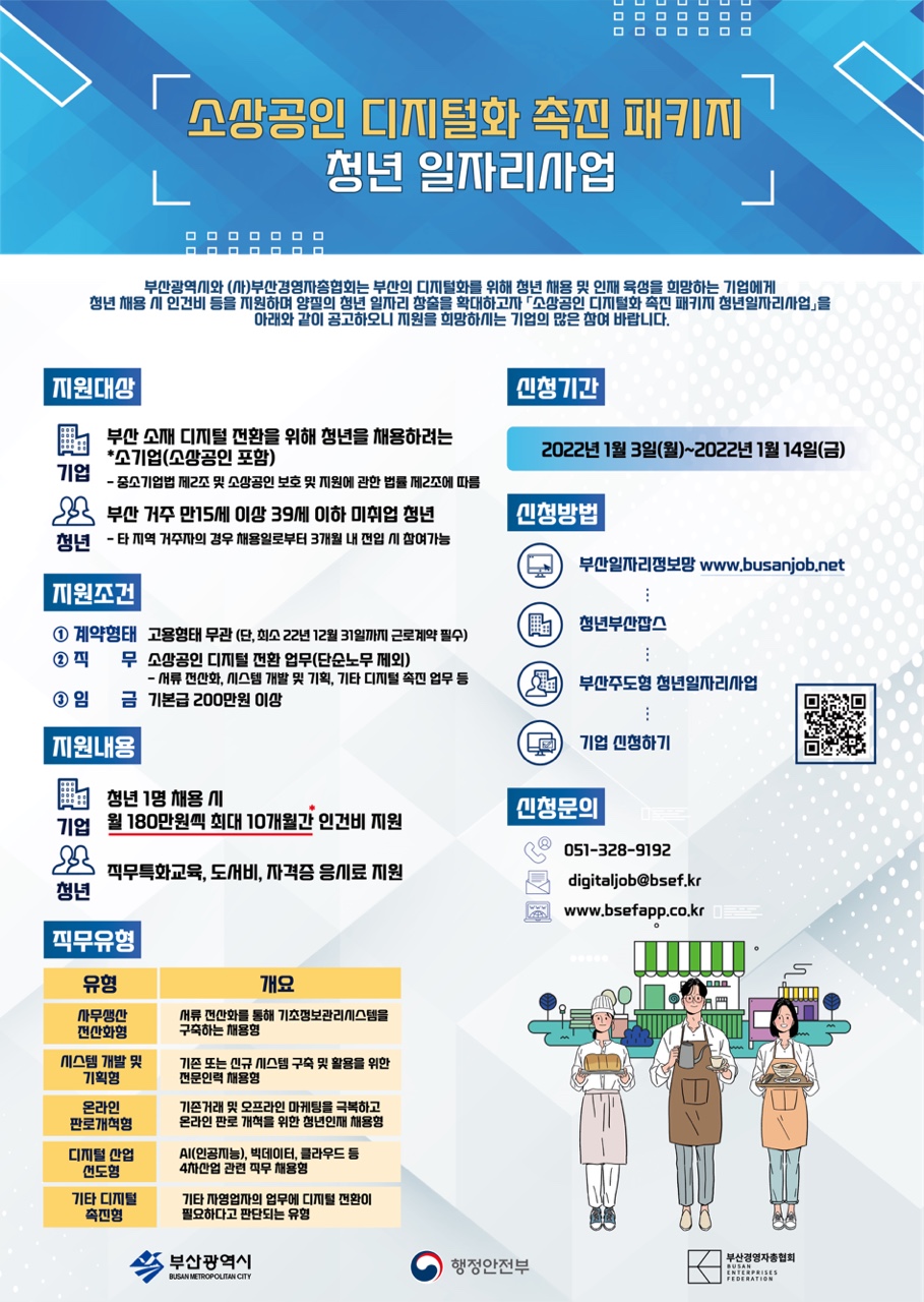 ▶ 지원대상 : 부산 소재 소기업 / 부산소재 미취업청년 (만 18~39세 이하) ▶ 주요내용 : 월별 인건비 180만원 지원 / 직무교육·훈련비 ▶ 청년채용조건 - (계약형태) 고용형탵 무관(단, 2022년 12월 31일까지는 고용유지 필수) - (임 금) 기본급 200만원 이상 - (채 용 일) 2022년 3월 1일(또는 2일) - (직 무) 디지털 전환 업무 (단순노무 제외) *아래 유형에 해당하는 직무 우대