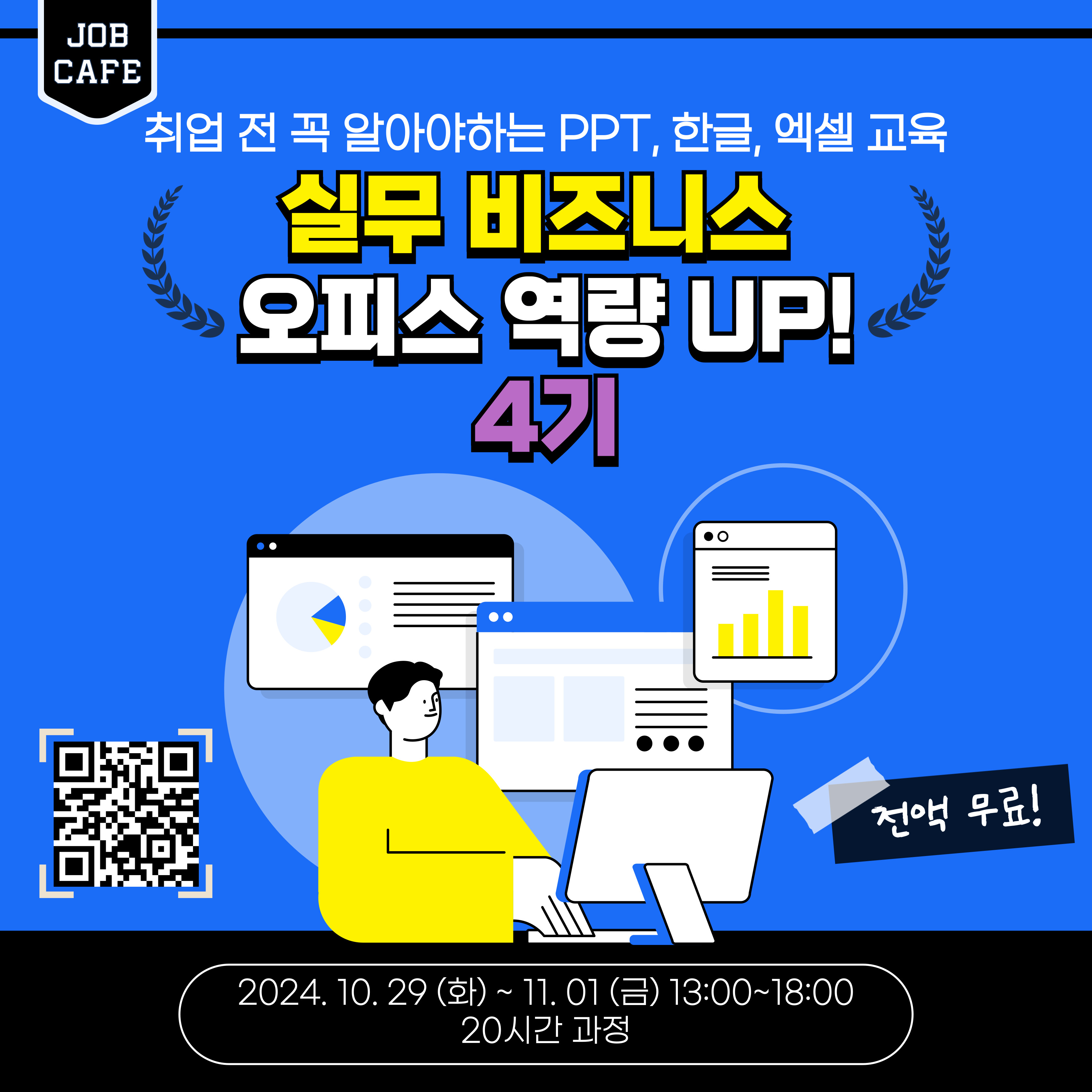 ※ 4일(20시간)과정으로, 전 교육과정 참여 필수입니다. ※ ′실무 비즈니스 오피스 역량 UP! 1~3기′ 참여자는 중복 참여가 불가합니다. ■ 프로그램명 : 실무 비즈니스 오피스 역량 UP! 4기 (취업 전 꼭 알아야하는 PPT, 한글, 엑셀 교육) ■ 일시 : 2024년 10월 29일(화) ~ 11월 1일(금) 4일간 13:00 ~ 18:00 (5h) (1일 5h x 4일, 총 20시간 과정) ■ 장소 : 코코스 코딩학원 (부산광역시 금정구 중앙대로 1942 11층 1101호) ■ 대상 : 부산 거주 미취업 청년 (만15~39세) 20명 ■ 모집기간 : 2024년 10월 15일(화) ~ 선착순 조기 마감 시까지 <부산 청년잡(JOB) 성장카페> 문의: 070-4150-5986 홈페이지: https://www.busanjobcafe.kr/edu