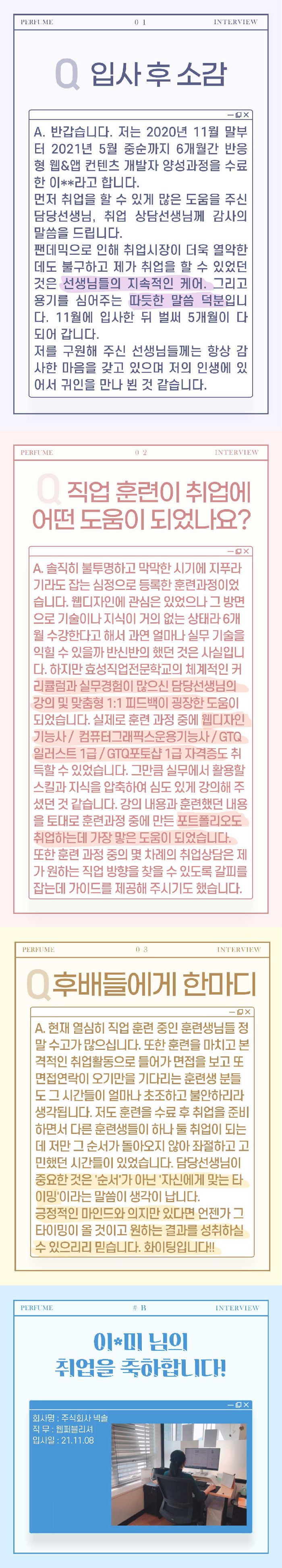 실무경험이 많으신 담당선생님의 강의 맞춤형 1:1 피드백이 굉장한 도움이 되었습니다.