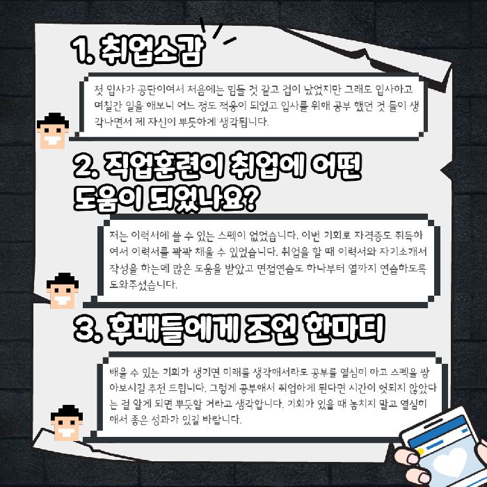 여러 자격증 취득부터 이력서 작성 면접 연습까지 철저하게 준비하면 모두 취업에 성공하실 수 있습니다.